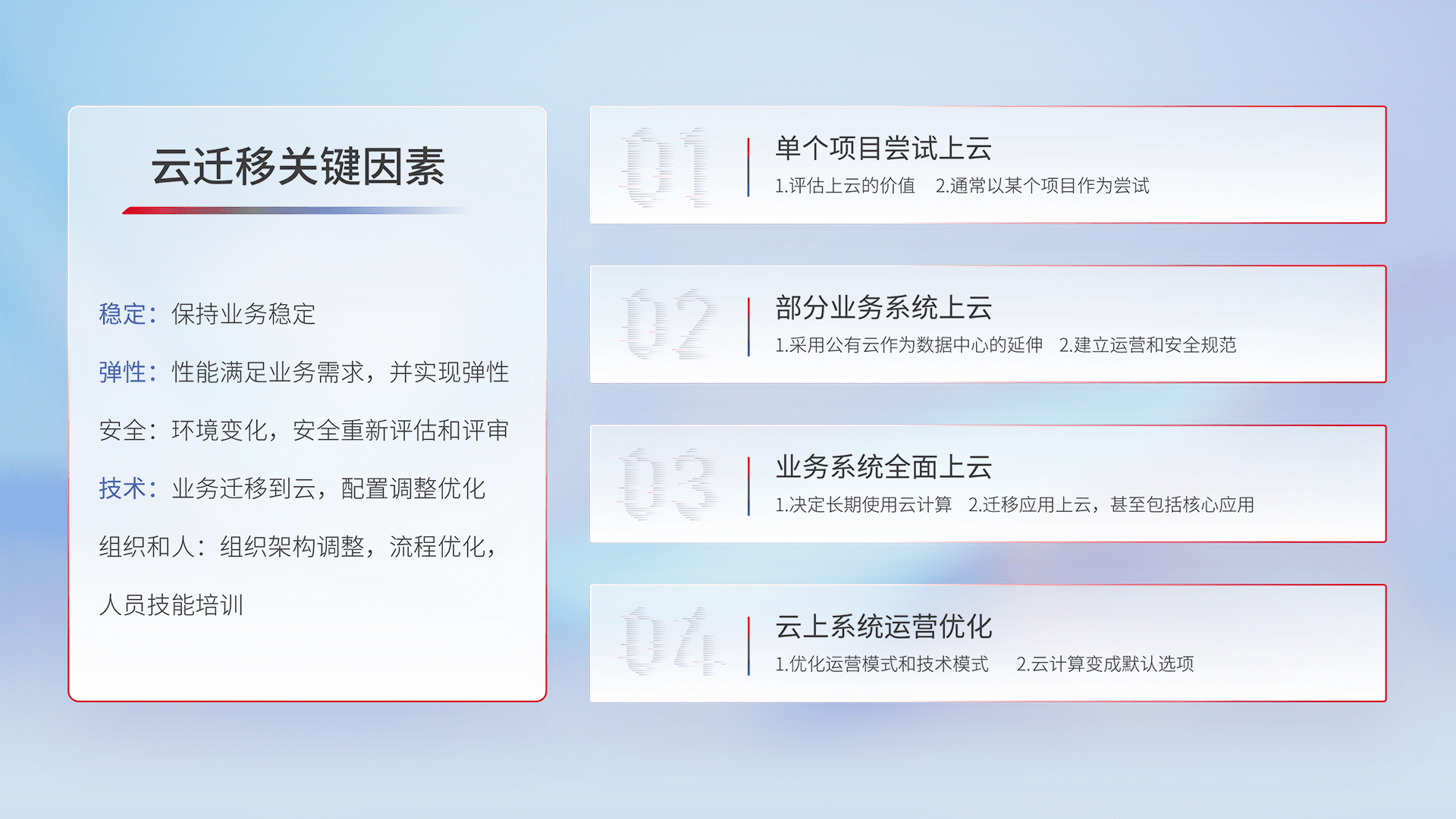 结合实际业务,,从规划设计、、云平台选型、、、云原生改造、、、数据迁移、、、集成交付,,迁移全过程为客户识别最佳上云路径,,,,做好风险识别管理,,,,设计网络架构、、、身份权限、、、安全审计合规、、、操作审计、、、日志审计、、监控告警策略、、多站点容灾设计等,,,对云上基础设施进行整体规划,,提升IT治理水平,,,,以满足弹性、、、高可用、、、高性能的需求。。。。