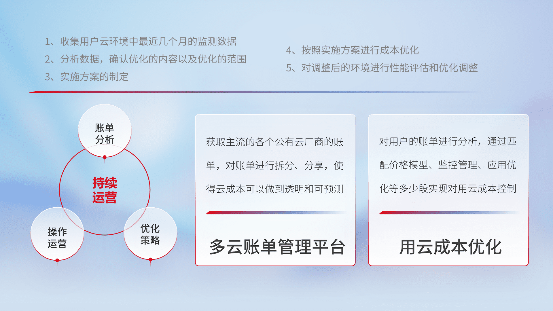 通过多云纳管,,以统一的资源数据模型把客户的云资源进行抽象和封装,,进而实现对多云资源的统一操作,,保障云资源管理的可靠性、、、稳定性与可用性。。量身定制化运维内容,,,,配置、、、、开发运维、、、、补丁管理、、、备份、、、监控、、、、认证和访问管理、、、、审计和日常巡检等,,,,保障在用云过程中的可靠度,,,稳定度以及高可用率。。。